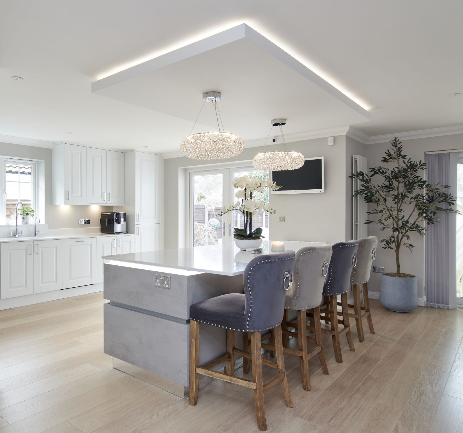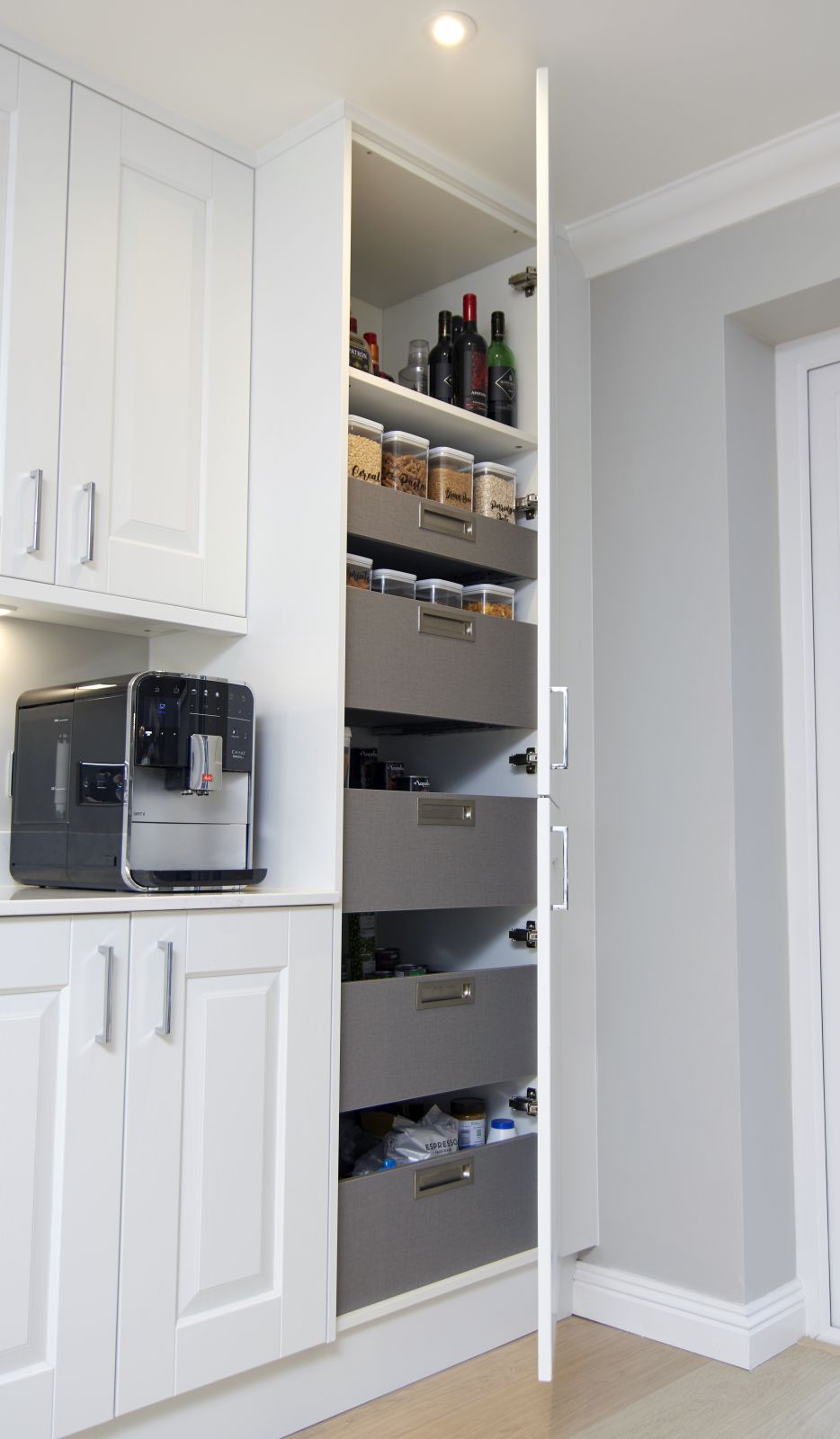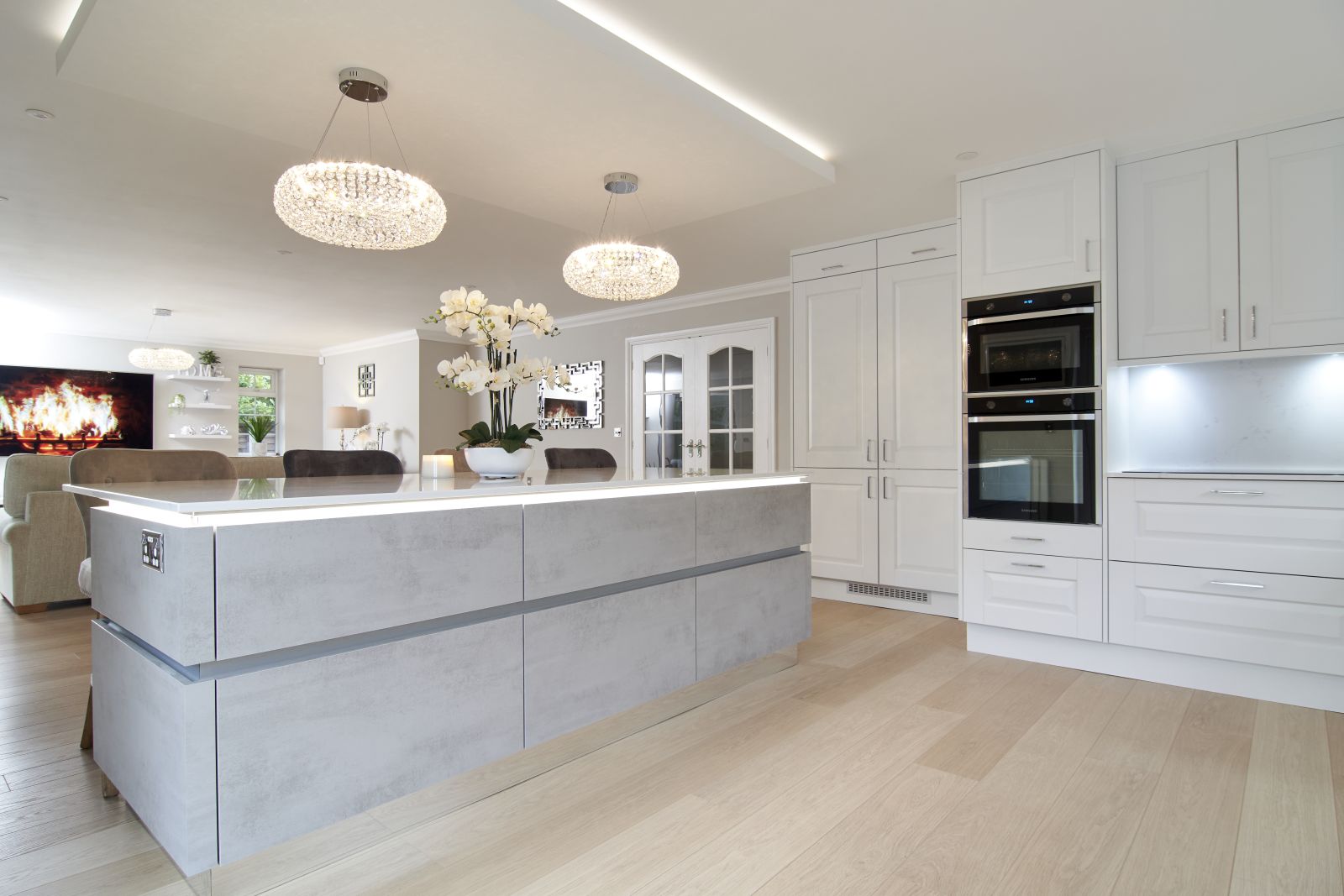 This Kitchen is from our Masterclass Kitchens range Carnegie White Painted Door with a modern Milano island in Silver Shadow.
