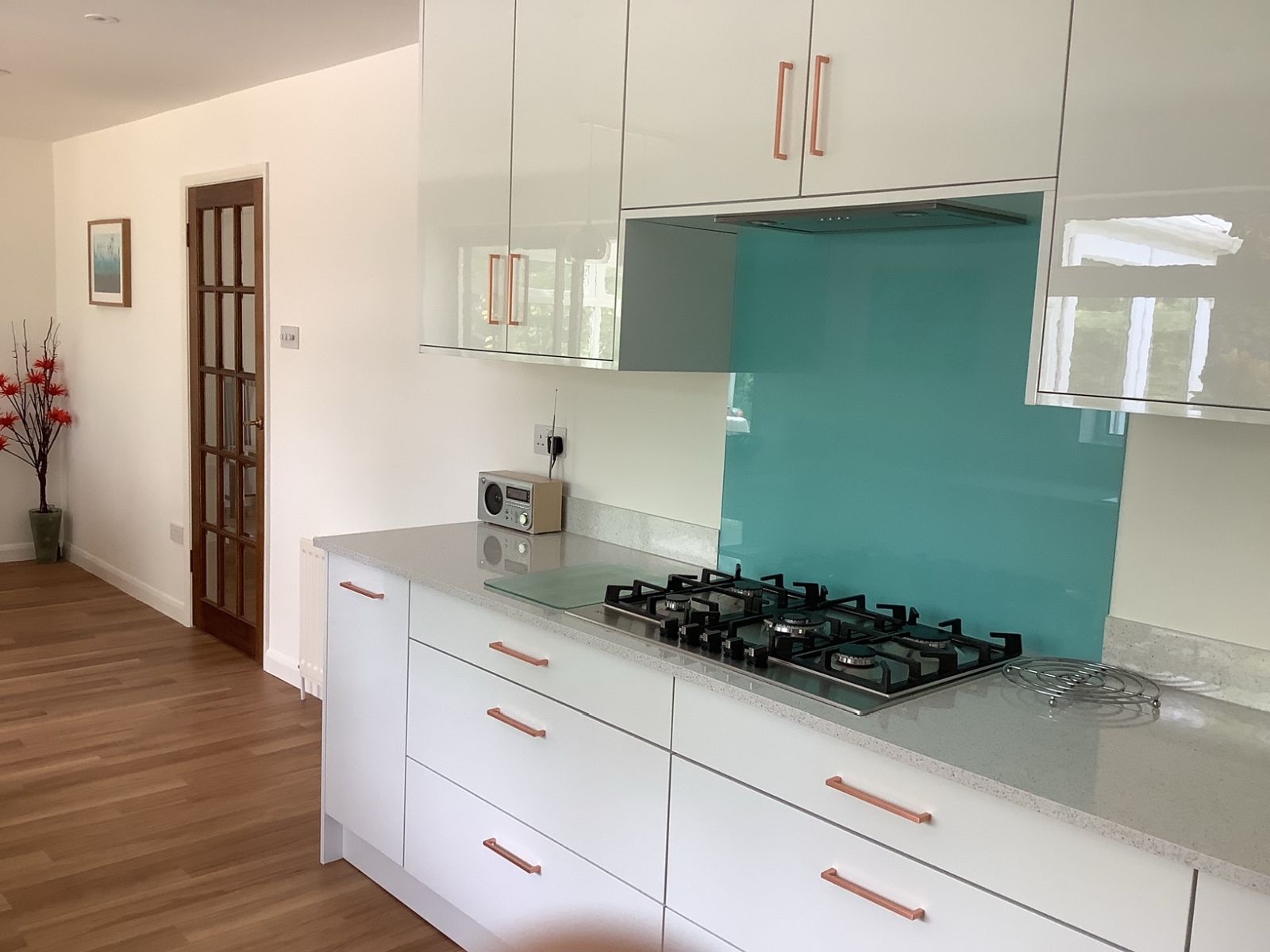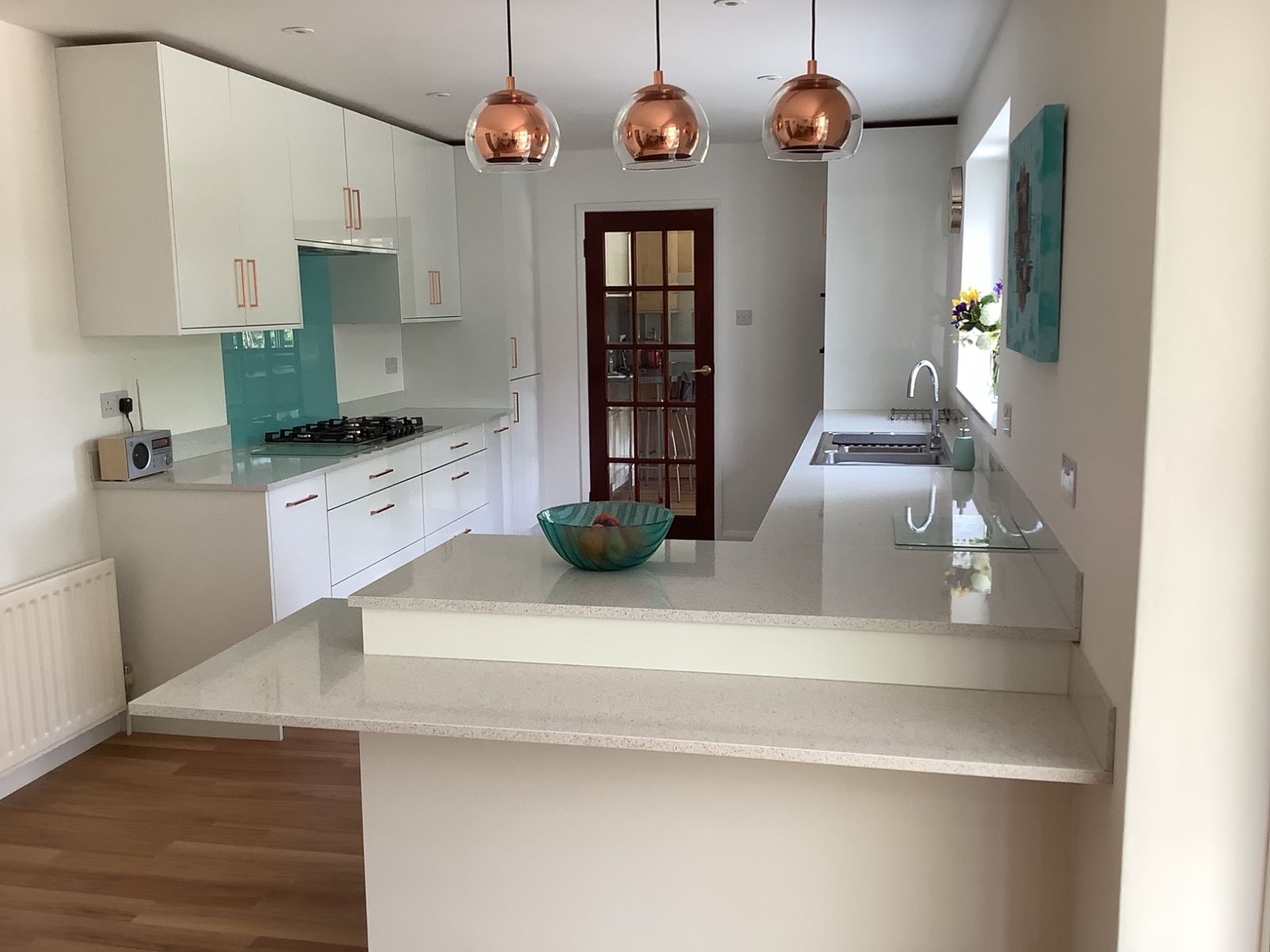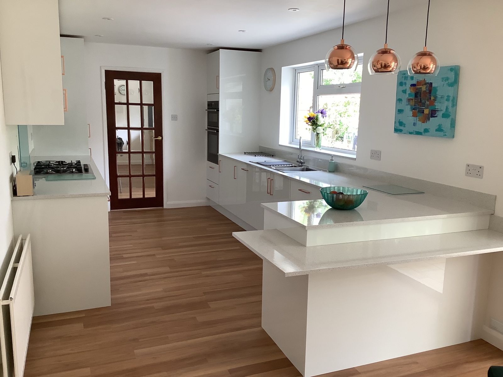 We love the accents of copper and colour our customer chose to complement their new gloss white kitchen which was designed, supplied and installed by us.